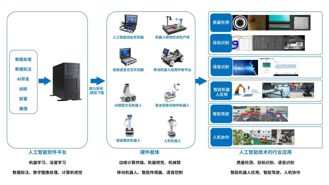 人工智能應(yīng)用與創(chuàng)新實(shí)驗(yàn)室采用軟硬件結(jié)合的方式,部署人工智能軟件框架和多款硬件設(shè)備。其中,人工智能軟件框架涵蓋了數(shù)據(jù)處理、數(shù)據(jù)標(biāo)注,以及AI開(kāi)發(fā)、訓(xùn)練、部署、推理等AI開(kāi)發(fā)全流程生命周期;硬件設(shè)備則包括人工智能綜合實(shí)驗(yàn)箱、六軸機(jī)器人視覺(jué)檢測(cè)生產(chǎn)線、復(fù)合型移動(dòng)協(xié)作機(jī)器人、基于視覺(jué)的移動(dòng)抓取機(jī)器人等四個(gè)部分。