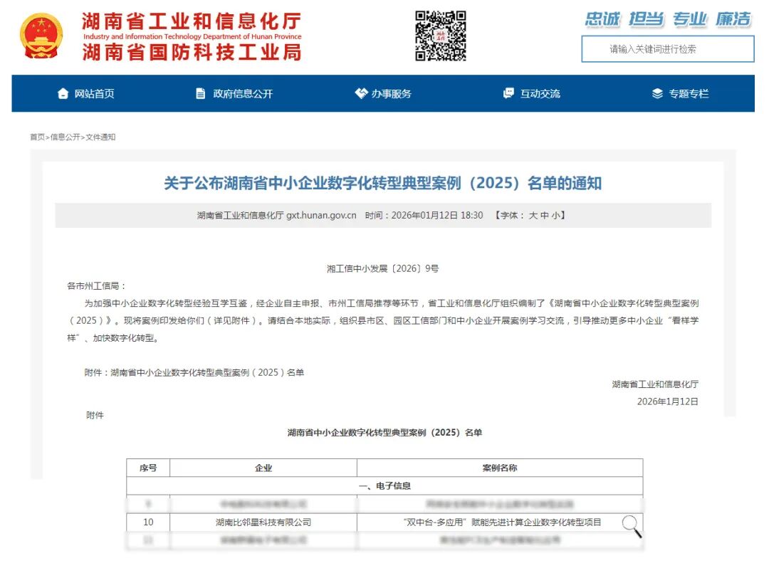 近日,湖南省工業和信息化廳公布了湖南省中小企業數字化轉型典型案例(2025)名單,比鄰星科技作為電子信息行業代表企業,憑借“‘雙中臺-多應用’賦能先進計算企業數字化轉型項目”成功上榜。